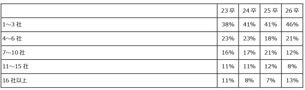 エントリーした企業数に関して継続して調査したところ、年々エントリー数が少ない学生が増えている結果となった。エントリー数が1〜3社の学生が46%、エントリー企業数が10社以下の学生が約80%を占めるなど、選考を受ける企業を厳選して、就職活動を進めていることがわかった。