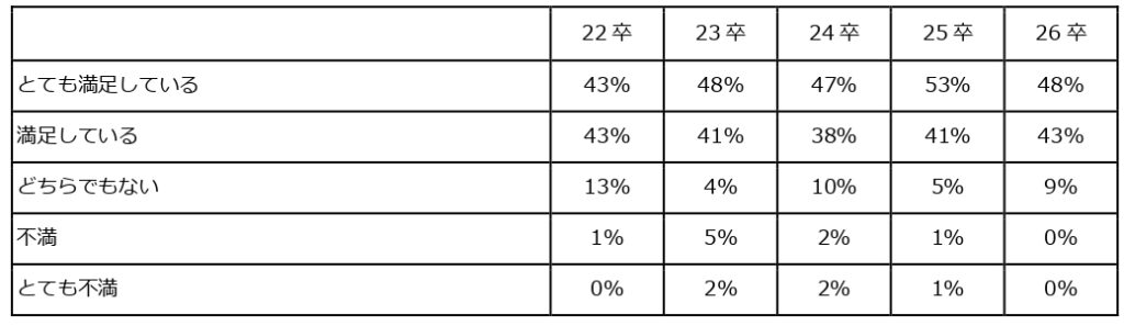 就職先企業に対して「とても満足している」「満足している」の合計は92%と非常に高い水準となり、「どちらでもない」がやや増えているものの、「不満」「とても不満」の割合が減少している。