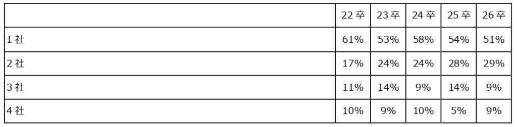 26卒で内定を獲得した学生の割合は、1社の内定で就職活動を終えた割合が51%、複数内定を獲得した学生が49%となった。22卒からの傾向としては、1社のみ内定者が徐々に減少し(22卒の61%から26卒では51%に減少)、2社から内定を得る学生が年々増えている。つまり、複数企業の内定を有している学生が増えており、内定辞退を避けるためのフォローなどの重要性が年々増している。