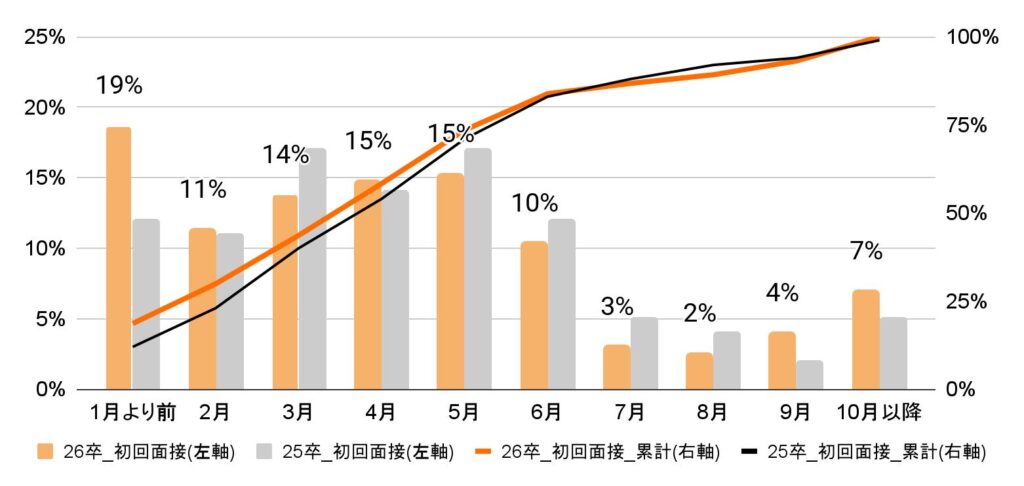 25卒のデータでは、3月〜5月に初回面接の割合で山ができていたが、26卒の集計は1月より前の時点で前年より6ポイント増えピークとなった。2月以降は緩やかに増えていくものの、5月以降は低下していることから、早期化の一端が見える。