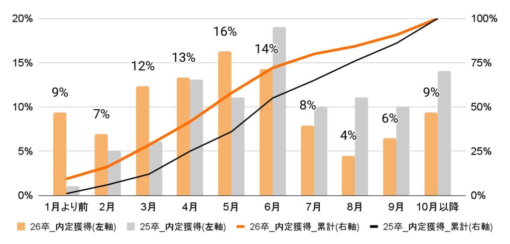 また、累計の数でも、1月より前の時点で獲得者数に開きがあることがわかる。25卒は、6月の時点で55%に到達していたが、26卒は5月時点で58%が内定を獲得しており、早期化の傾向が顕著に表れている。