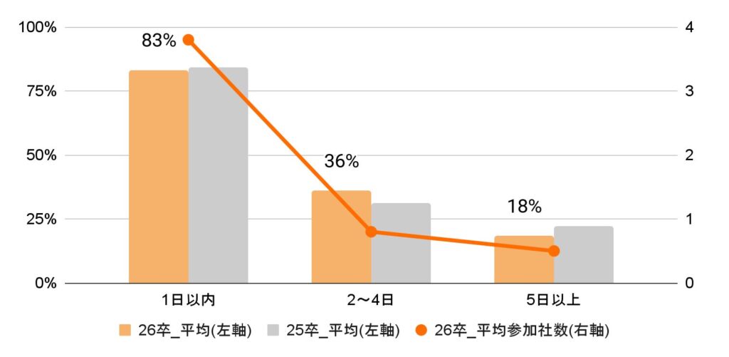 1日で完結するインターンシップ等のプログラムに参加する学生が最も多く83%おり、1人当たり1日以内のプログラムでは、平均3.8社に参加している。一方、2〜4日間型(0.8社)、5日以上(0.5社)は例年通り比較的少ないことがわかった。昨年と比較すると2〜4日間型のプログラムに参加している学生が若干増加していることがわかった。