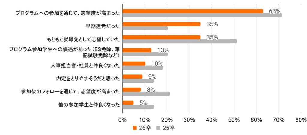 インターンシップ参加企業への本選考応募理由として、「プログラムへの参加を通じて志望度が高まった」が62%と最も多く、次いで「早期選考だった」が35%となっている。これは、もともと就職先として志望していることも含め、インターンシップでより企業理解を深めたことや、選考時期の早さをインターンで確認することが志望度を高める要因となっていることを示している。