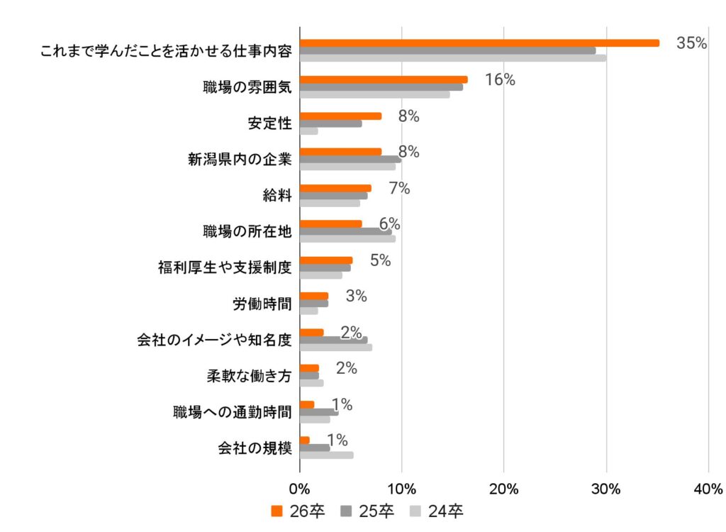 昨年に引き続き「これまで学んだことを活かせる仕事内容」が最も重視されており、昨年度の集計を上回る35%であった。次に「職場の雰囲気」と回答した学生が16%と2番目に高く、3番目に「安定性」が8%と昨年度の6%から増加している。「新潟県内の企業」が若干割合を下げ、「給料」は7%とほぼ横ばいで推移している。