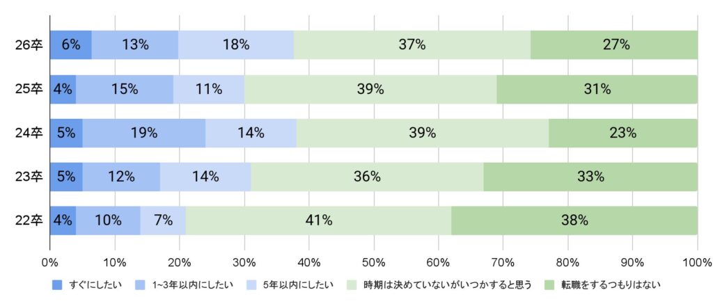今後の転職活動に対する学生の考えについては、「いつかすると思う」の割合が最も多くなった。「1〜3年以内にしたい」と回答した学生の割合は減少している。その一方、「5年以内にしたい」の回答が増え、昨年度までに引き続き、「内定先の企業には満足しているが、ある程度働いて今後のキャリアを見直したい」と考えている可能性があり、入社後のフォローや関係性構築、定着施策が求められている。