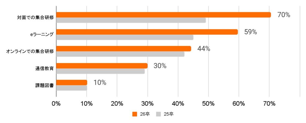 内定者研修や課題で望ましい形式としては、「対面での集合研修」を希望する回答が70%と最も多く、次いで「eラーニング」(59%)、「オンラインでの集合研修」(44%)となった。昨年度も「対面での集合研修」が最も多い回答だったが、本年度はよりその傾向が顕著に表れていることがわかる。